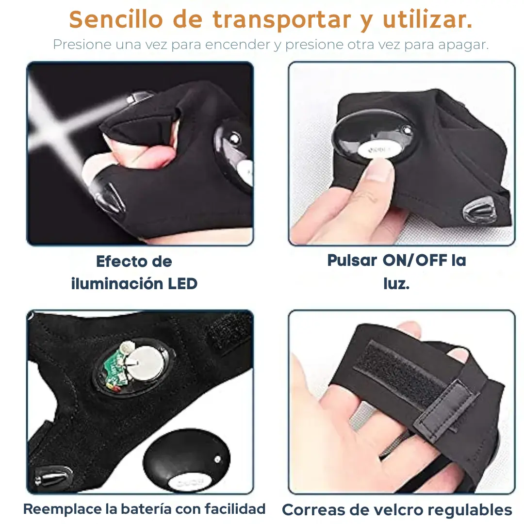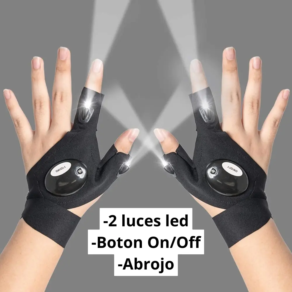 Los guantes cuentan con potentes luces LED integradas en los dedos índice y pulgar, que te permiten tener iluminación directa justo donde la necesitás. Son cómodos, ajustables y 100% manos libres.